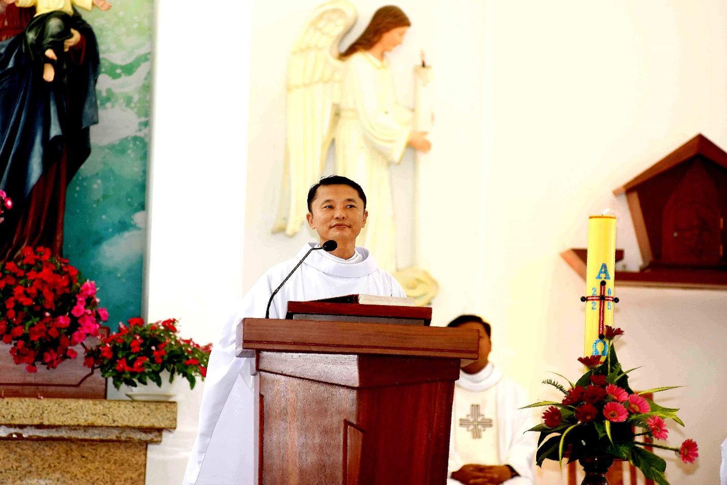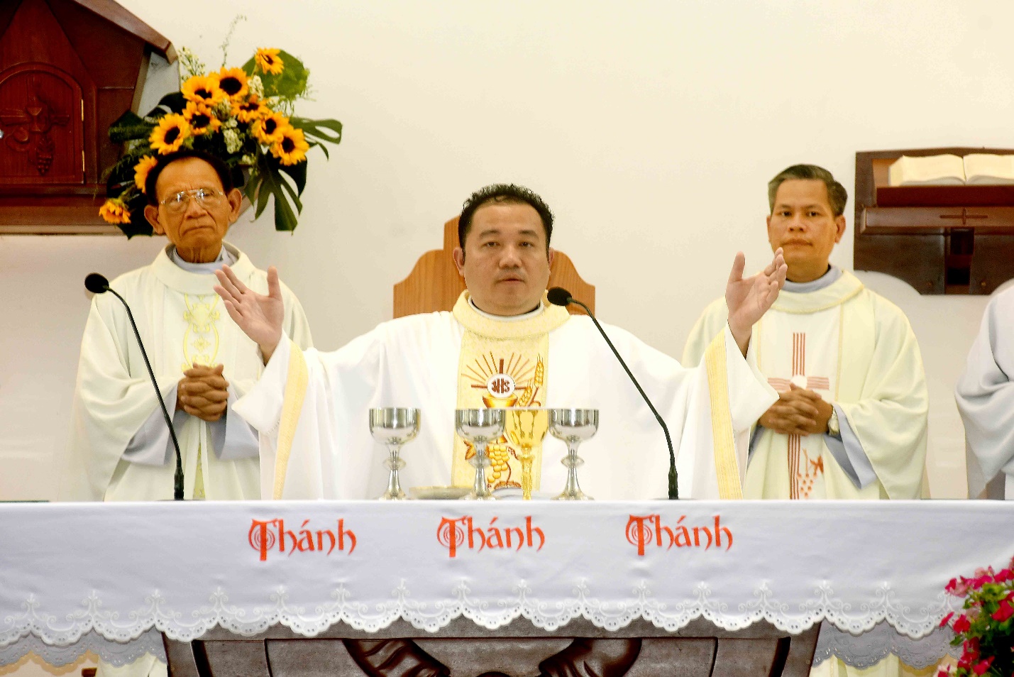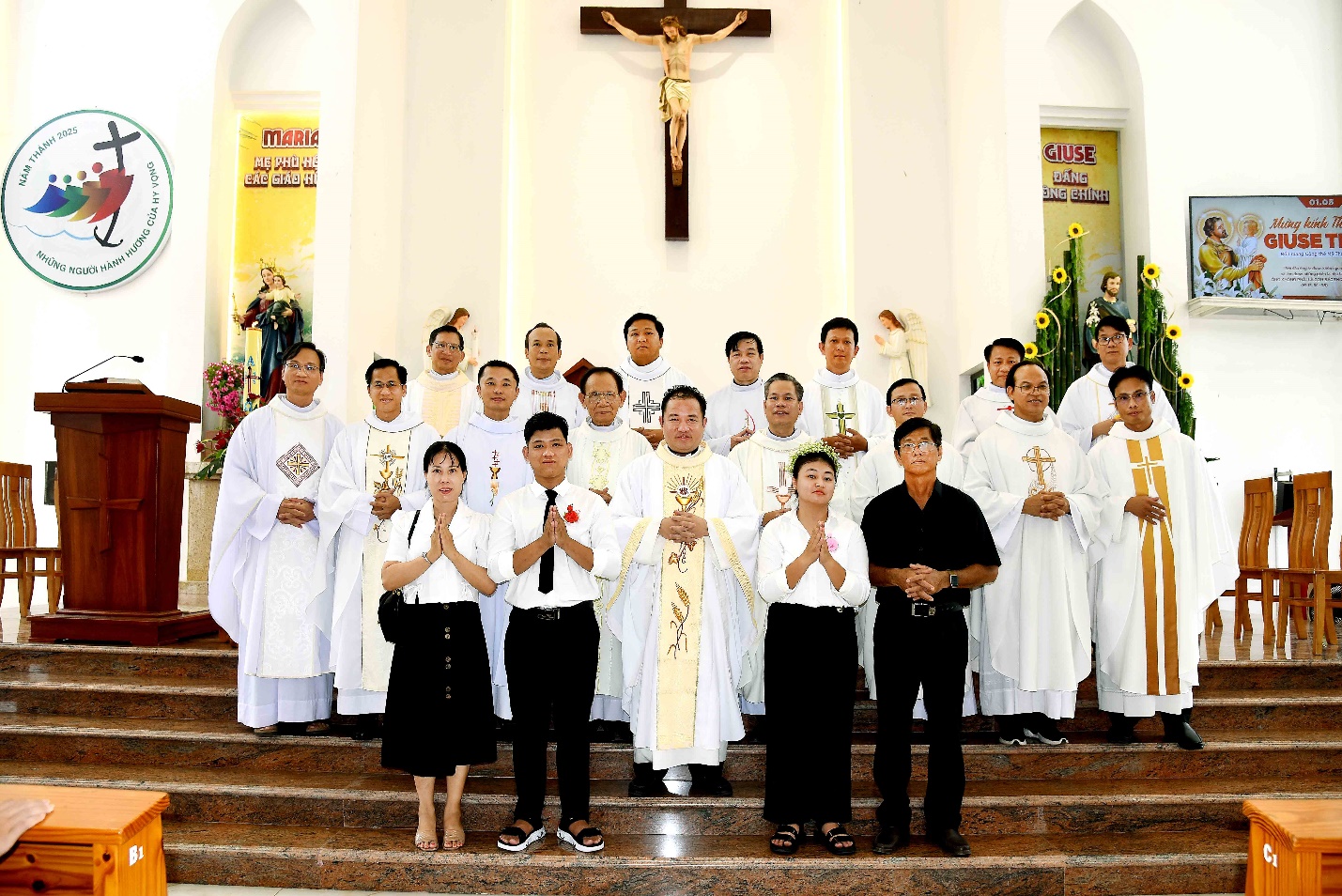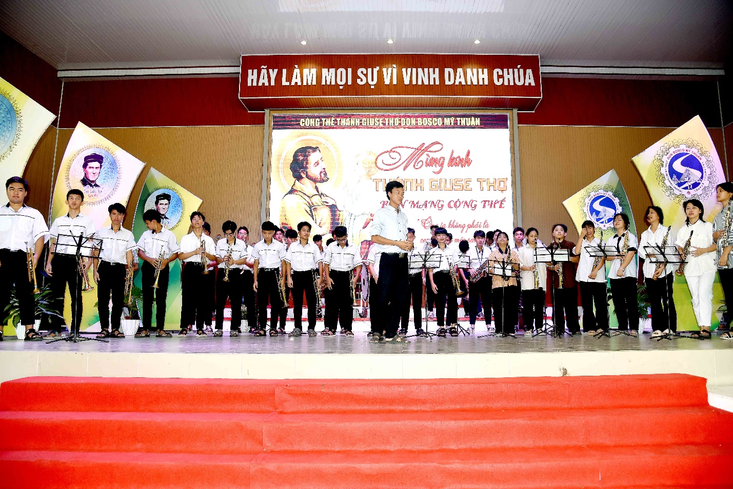 Sau các phần Nghi thức là Thánh lễ Bổn mạng Giuse Thợ ngày 1/5 năm nay diễn ra tại Trường Trung cấp Kỹ thuật Don Bosco Mỹ Thuận (Vĩnh Long) khá long trọng với sự tham dự của cha Cha Quản lý Tỉnh dòng Saledieng Don Bosco Việt Nam- Nicolai Kiều Long Hồ, Cha Guise Nguyễn Trí Dũng- Trưởng Ban Truyền thông Saledieng Don Bosco Việt Nam. Cùng Cha Giám đốc nhà trường Micae Hoàng Văn Khấn và cùng quý cha, quý thầy, quý sơ và gần 350 học sinh cộng thể của nhà trường. Quang cảnh buổi lễ. Mở đầu Thánh lễ, Cha Micae Hoàng Văn Khấn thay mặt Cộng thể Don Bosco Mỹ Thuận đã khơi gợi tâm tình hân hoan của toàn thể Giáo Hội trong ngày mừng Thánh Giuse Thợ trong bài giảng lễ, Cha Micae đã diễn giải cho cộng thể về lời mời gọi mỗi người cảm nhận cuộc sống của mình phản ánh hình ảnh của Thiên Chúa qua lao động. Mẫu gương tuyệt vời là nơi Thánh Giuse và nơi gia đình Thánh gia: “Hãy nhìn vào gia đình Thánh gia để cảm nhận nơi đó những bài học cho chúng ta. Cha Micae Hoàng Văn Khấn phát biểu. Bài học về thinh lặng, bài học về tình yêu, bài học về lao động, bài học về cầu nguyện, bài học về Đức tin.”Để nhờ những bài học đó “người Kitô hữu phản ảnh giá trị tình yêu Thiên Chúa trong công ăn việc làm, trong lao động, trong kiến tạo với sự bảo trợ của Thánh cả Giuse”. Cha Nicolai Kiều Long Hồ đã nêu lên phát huy thành quả đạt được của cộng thể. Tại đây Cha Nicolai Kiều Long Hồ đã phát huy thành quả đạt được của trong những năm qua là đáng khích lệ. Ngài kêu gọi cộng thể nhà trường cần phát huy hơn nữa để tương lai của các bạn trẻ sẽ trở thành những người thợ giỏi trong tương lai. Và ước mong với ơn Chúa chan hoà, sự phù trì của Thánh Giuse Thợ và cộng thể Don Bosco Mỹ Thuận sẽ đồng tâm nhất trí xây dựng đời sống Đức tin, và chung tay hoàn thiện ngôi Nhà “thợ” đang phát triển. Sau thánh lễ, quý cha đã chụp ảnh lưu niệm. Sau cùng là buổi cơm ấm cúng của gia đình và chương trình văn nghệ phục của các học sinh Trường TCKT Don Bosco Mỹ Thuận.